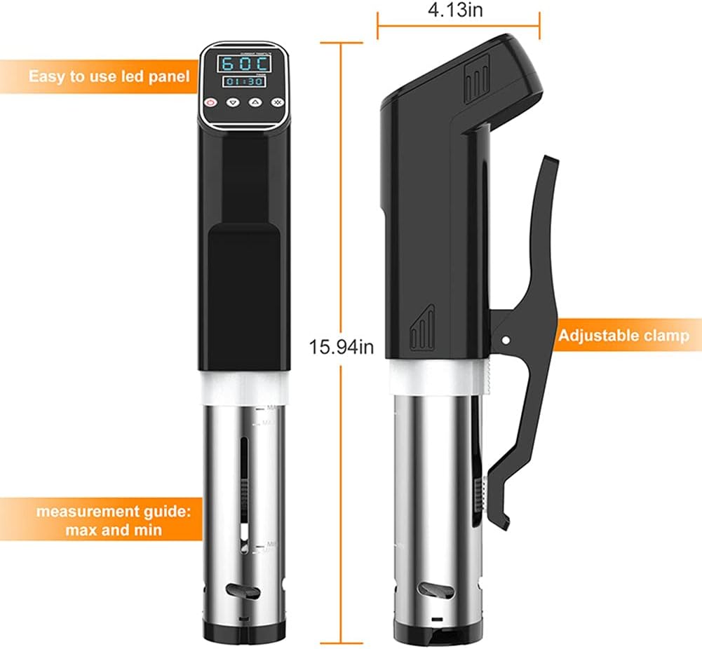 2000w sous vide stove, thermal immersion circulation machine with large digital lcd display, time and temperature control, quiet & accurate, stainless steel tubeHow to use:1. simply place the stove in any pot, add water, place it in a sealed bag.2. place the ring clamp on the side of your container, turn the clamp knob until it is tight.3. place the circulator on the ring clamp. turn the clamp knob until tight.4. adjust the temperature over time and press start.Package:1X Slow CookerProduct specifications:Materials: stainless steel tube, food grade pp (circulation pump cap)Input power: AC220-240V / AC110-120VPower: 2000 w / 1500 w, 50/60 hzTemperature range: 5--100100 (41 ° f-212 ° f)Exact temperature: ° c ± 1%Circulation pump: 8.50 lpm / 2.25 gpm maxMaximum bath size: 15lSize: 144 * 103 * 444mm